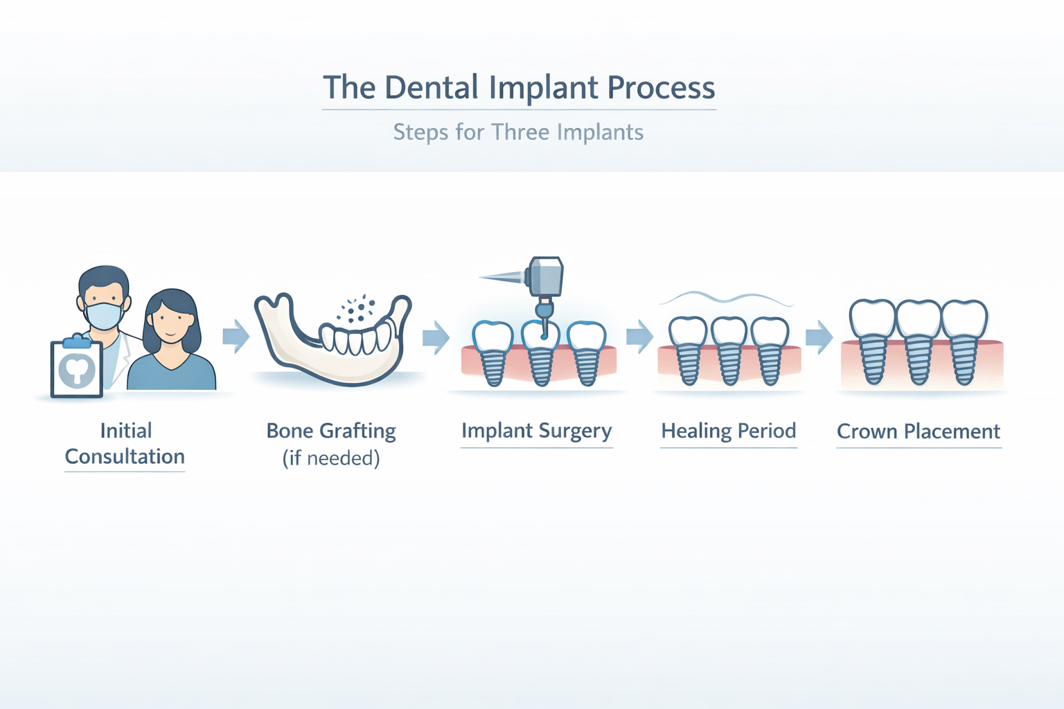 A: The entire process for 3 dental implants, from initial consultation to final crown placement, typically takes 6 to 12 months, including healing periods.